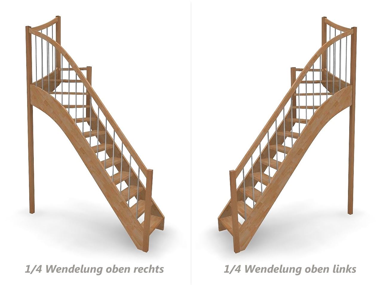 Nebentreppe,Wangentreppeaus massiv Buchemit 1/4 Wendelung oben und Geländer außen ab Antritt bis Austritt mit ►Edelstahl Sprossen und durchgehend geschwungenemHolzhandlauf.