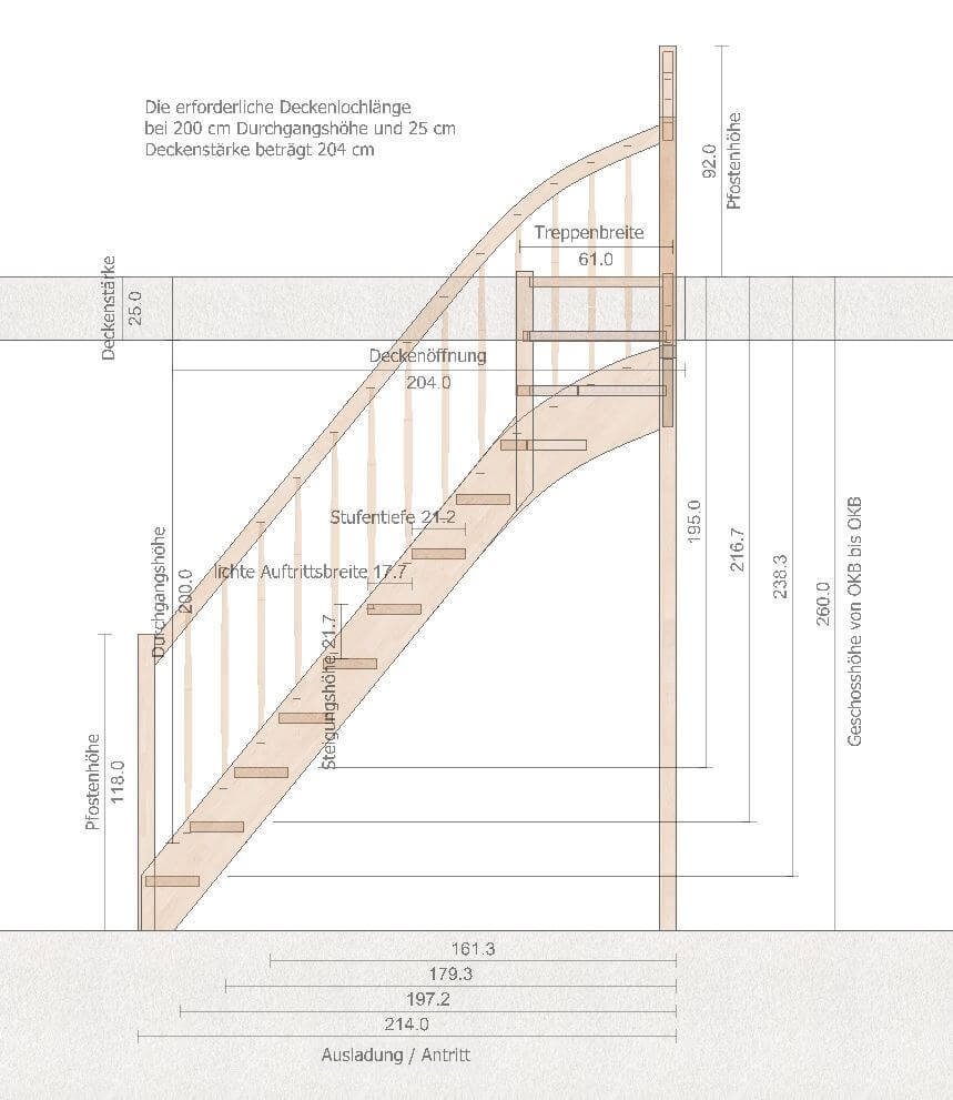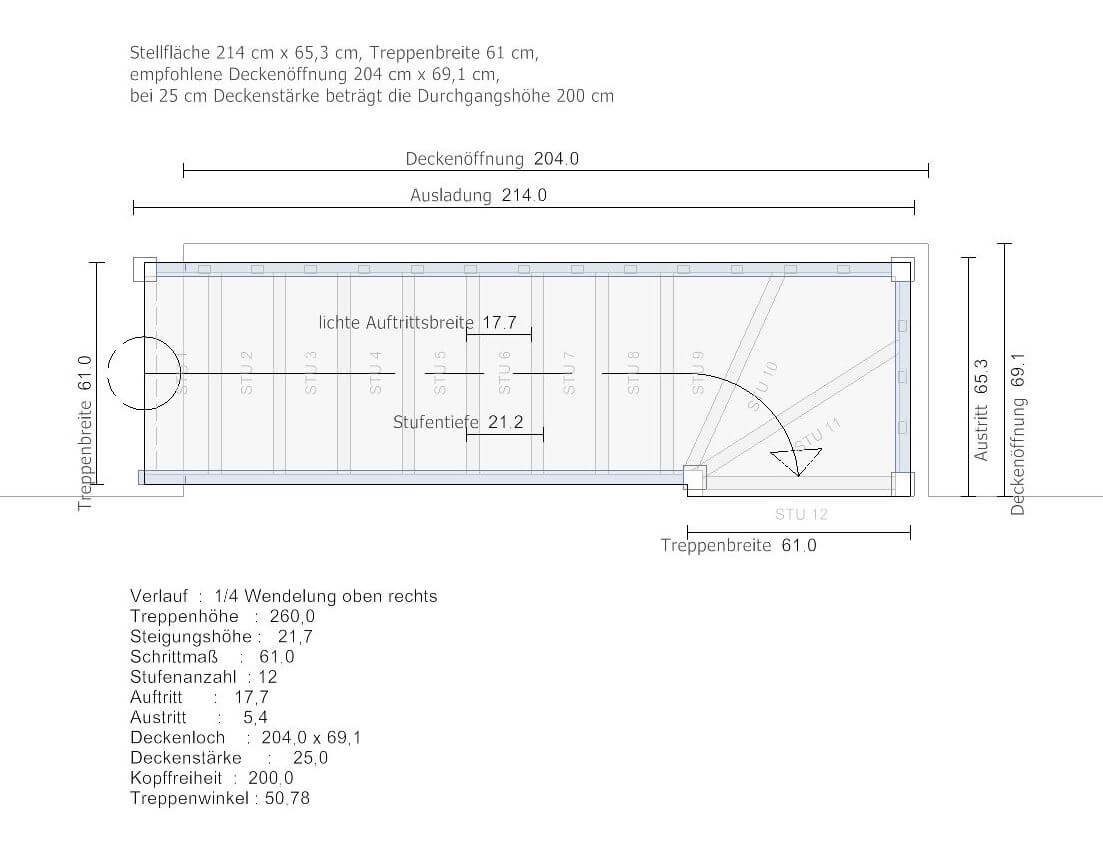 volle breite Stufen, 12 Steigungen, 11 volle Stufen und Austrittsstufe, Geschosshöhe 260 cm, Stellfläche 214 cm x 65,3 cm, Treppenbreite 61 cm, Materialstärke 40 mm.