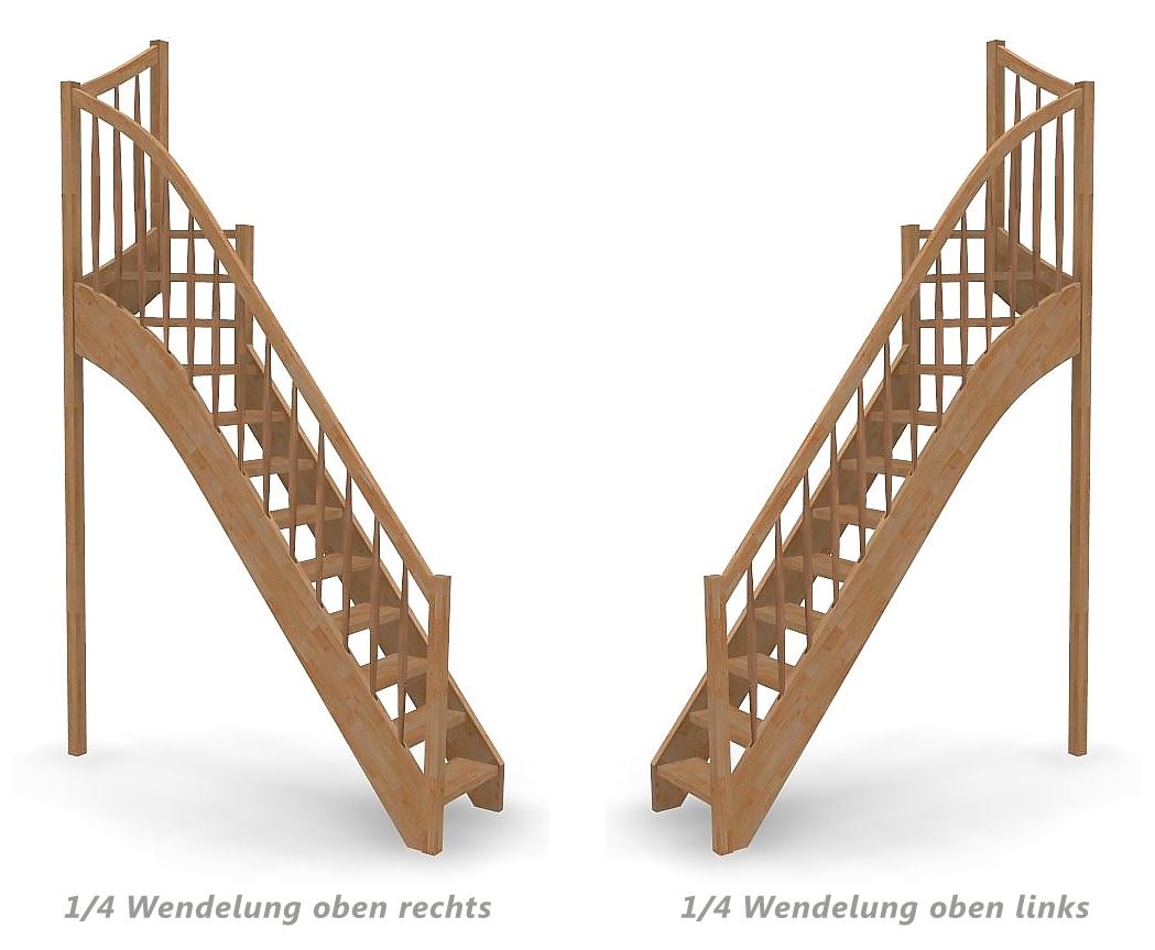Raumspartreppe mit 1/4 Wendelung oben aus 40 mm Buche mit Rechteckstab Sprossen Geländer außen ab Antritt bis Austritt. Treppenbreite 61 cm
