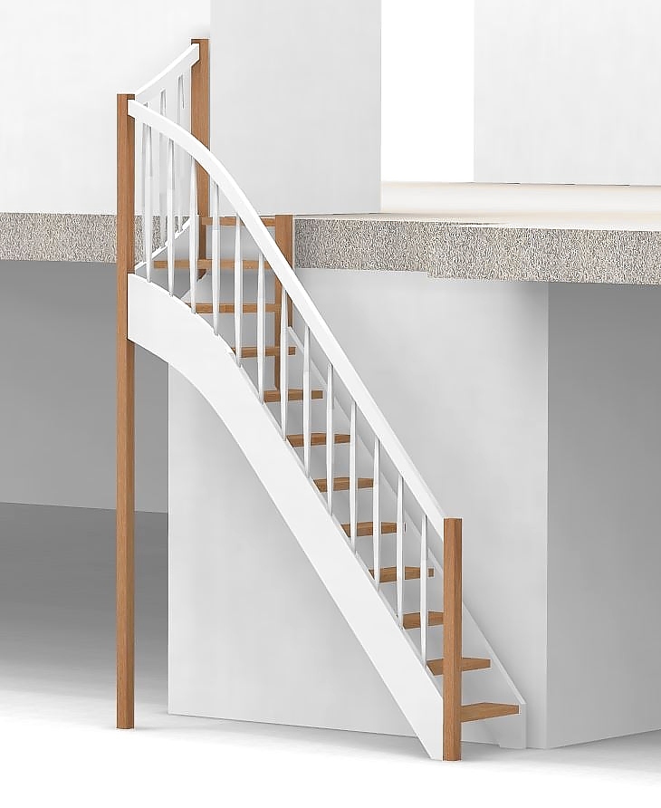 Wangentreppe, Raumspartreppe aus massiv Buchemit 1/4 Wendelung oben und Geländer außen ab Antritt bis Austritt mit ►Rechteckstab Sprossen und durchgehend geschwungenemHolzhandlauf.